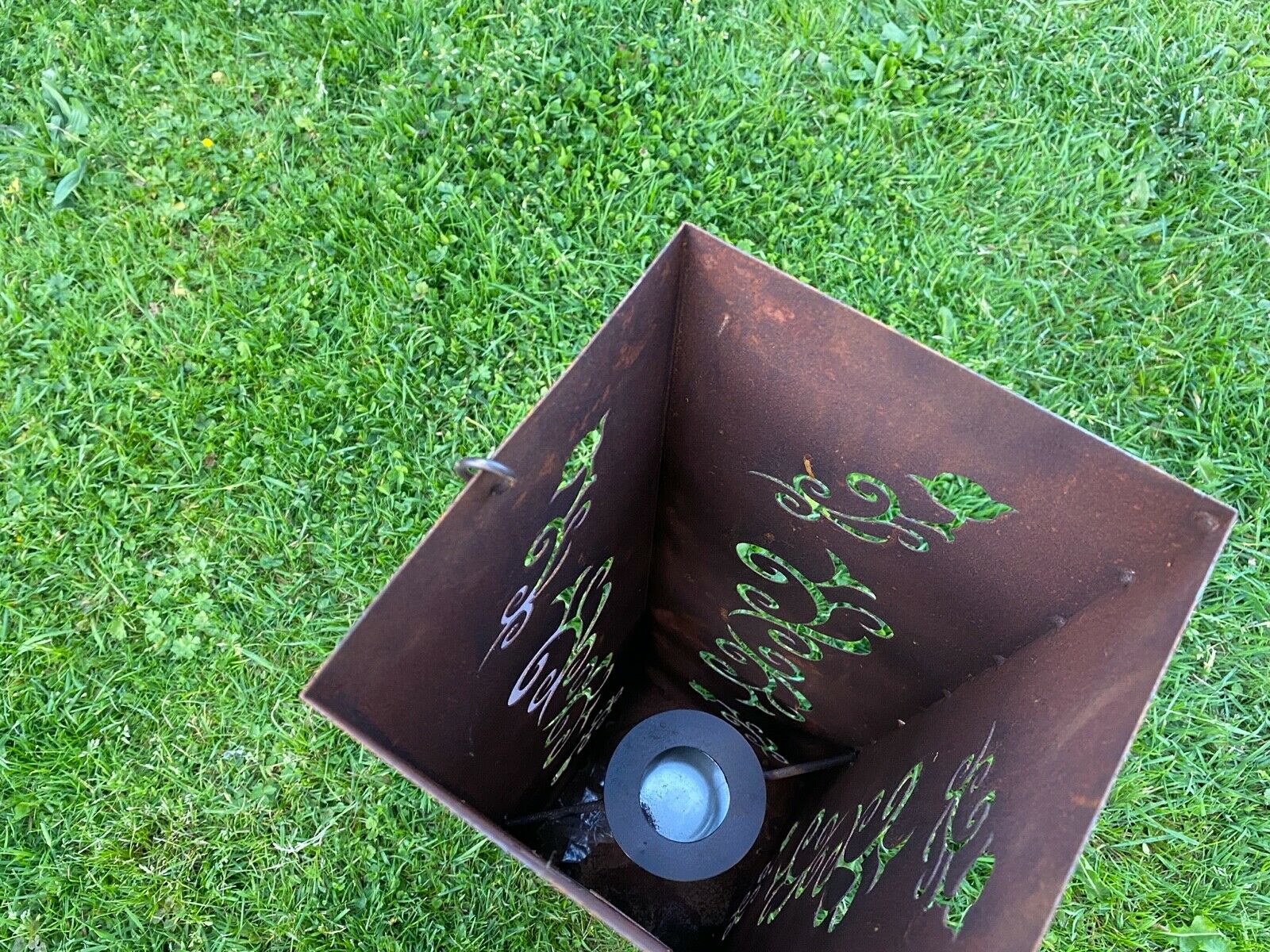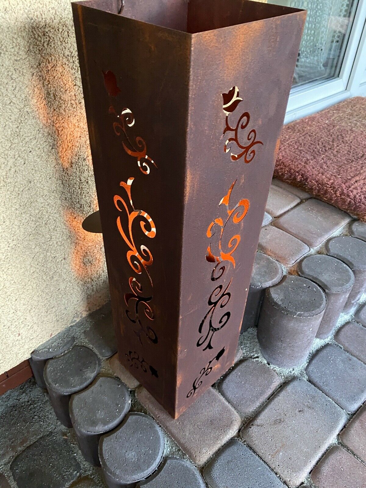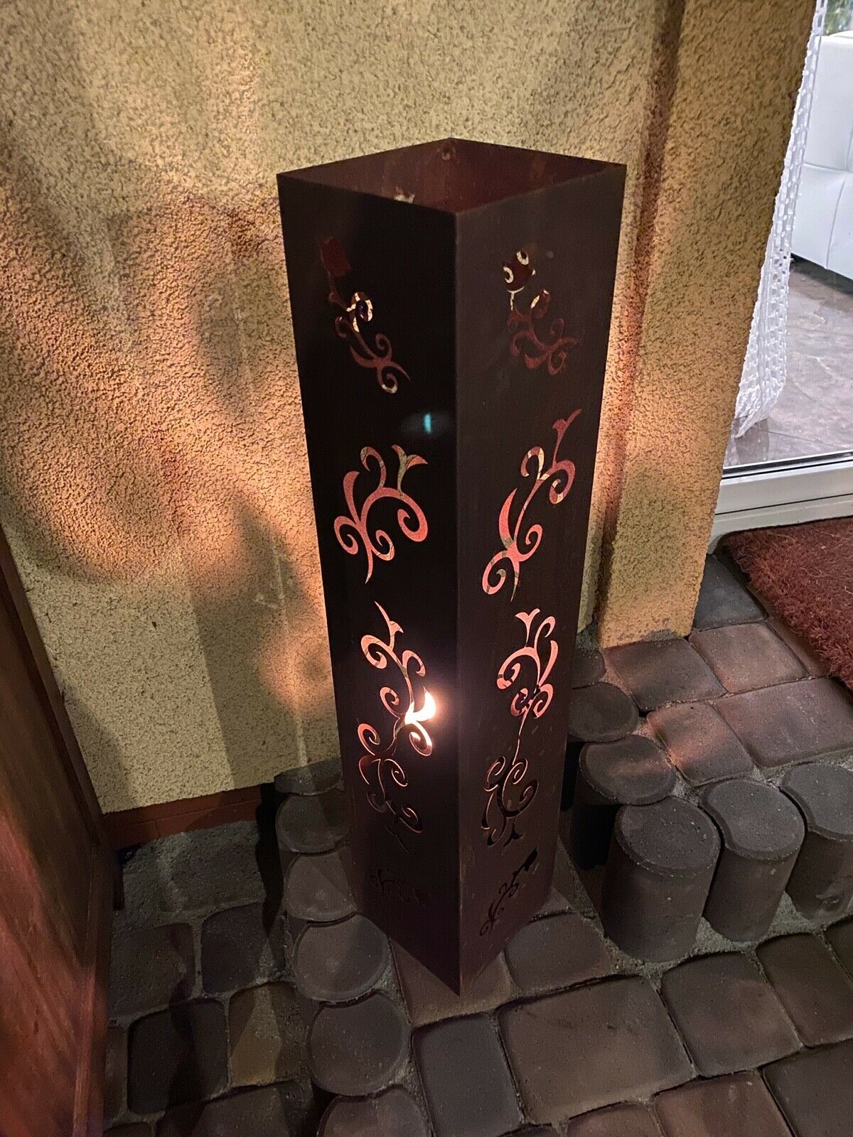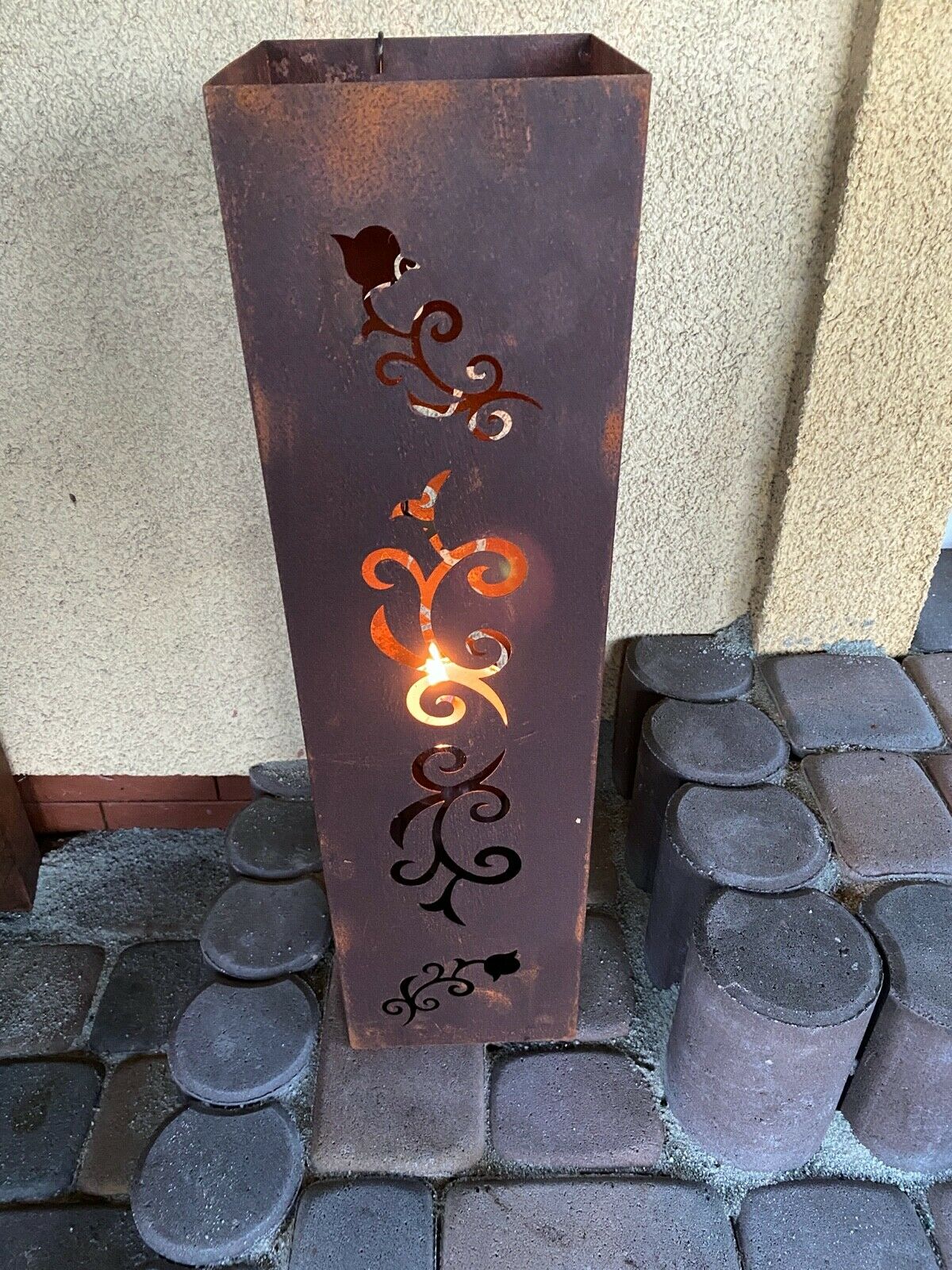 Im Inneren befindet sich ein Behälter, auf den wir eine Kerze stellen oder Bioethanol gießen können. Diese Laterne ist eine schöne Dekoration des Hauses und des Gartens, jedes Element ist handgefertigt.
