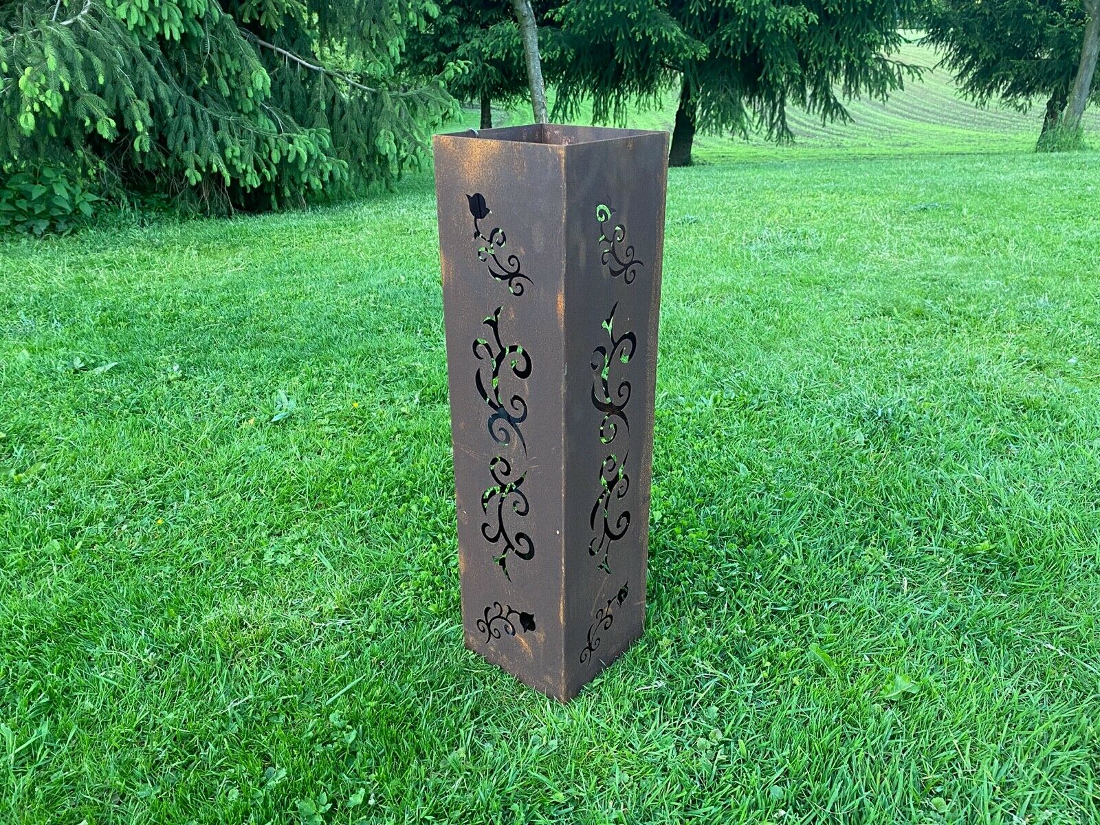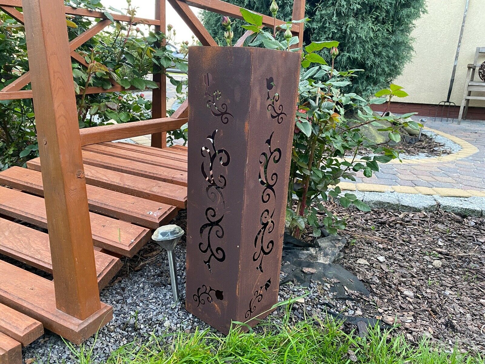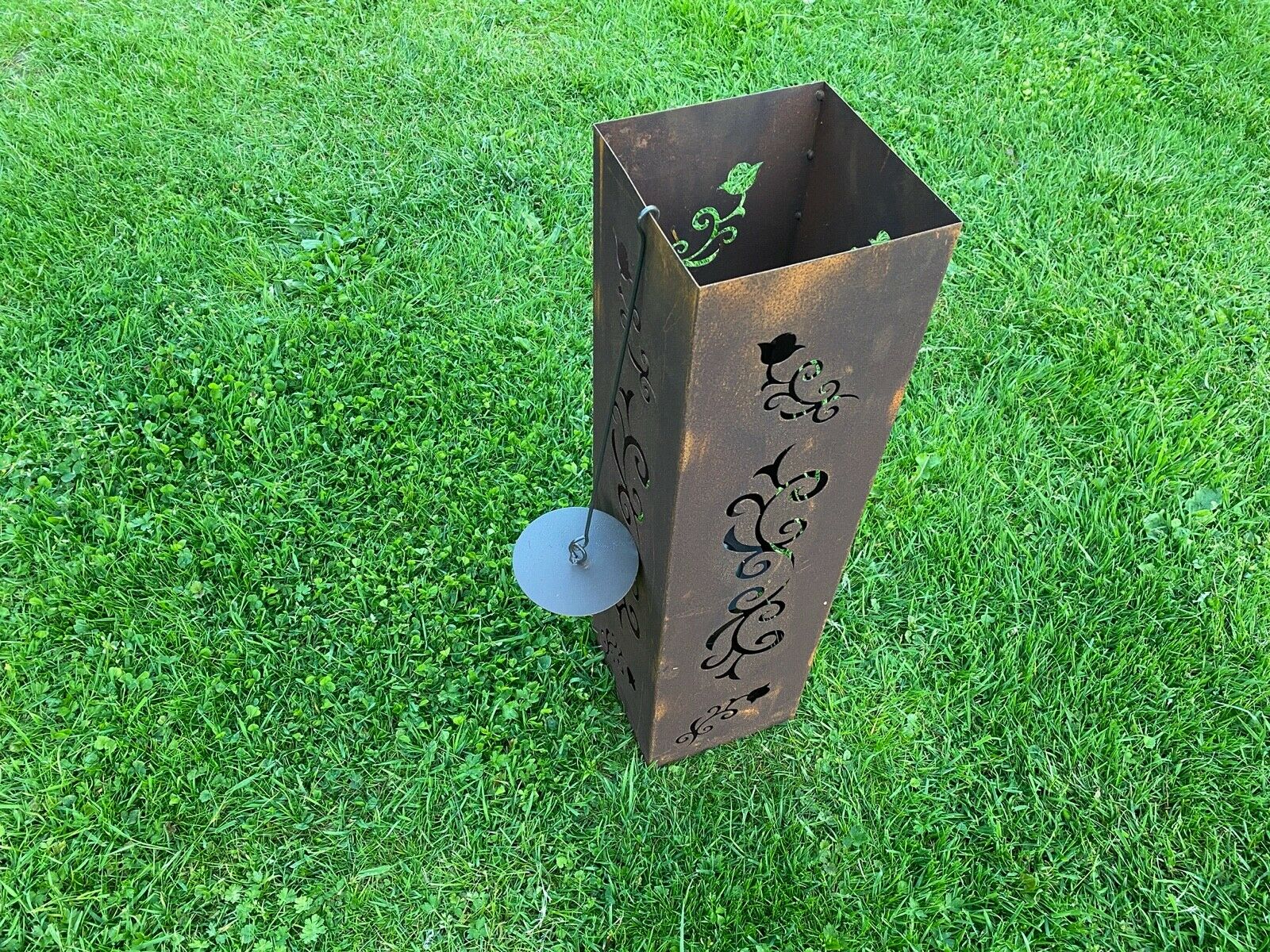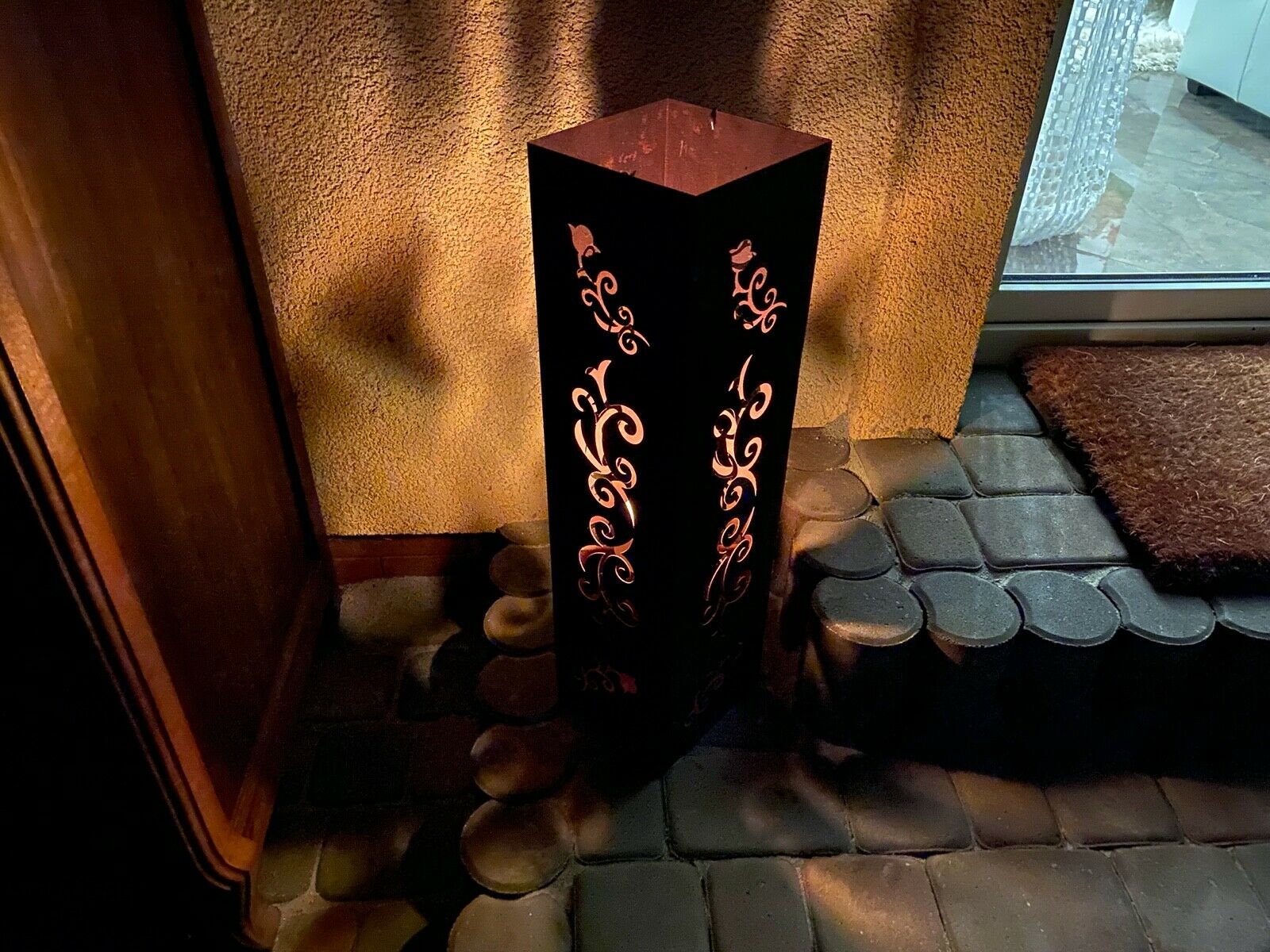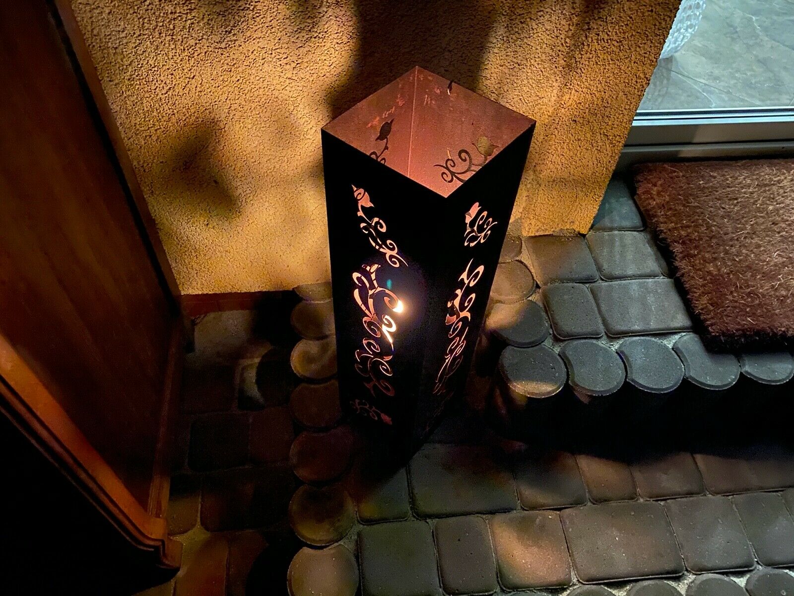 Im Inneren befindet sich ein Behälter, auf den wir eine Kerze stellen oder Bioethanol gießen können. Diese Laterne ist eine schöne Dekoration des Hauses und des Gartens, jedes Element ist handgefertigt.